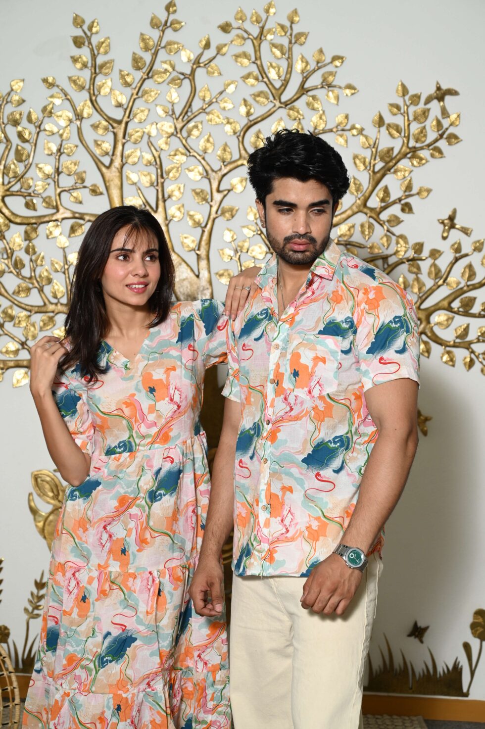 Couple Matching Abstract Print Cotton Anarkali Midi Dress & Shirt Set ? Multicolor Summer Outfit